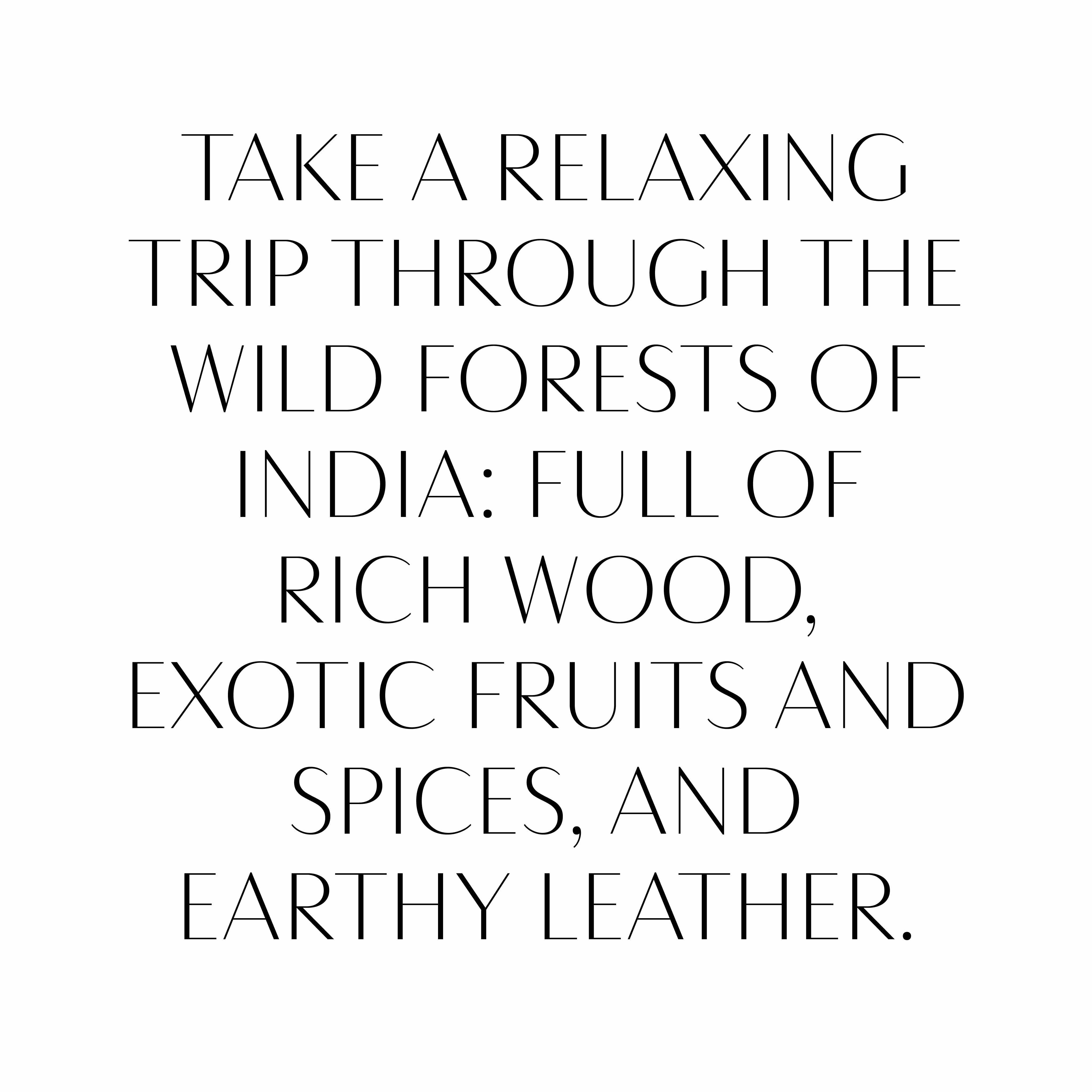 A Journey Through the Sandalwood Forest The radiant July sun shines down on the wild woods. Enthralling spices mingle with fresh citrus and creamy sandalwood. Cardamom and sage grow lush and free at the edge of the woods, waiting to be gathered into rich herbal teas. A home fragrance that brings smoky elegance and spicy warmth to your ambiance. Top Notes: Green Cardamom, Brazilian Mandarin, Grapefruit Peel Heart Notes: Black Chili, Cracked Clove, Spanish Sage Base Notes: Cedarwood, Creamy Sandalwood, Sultry Amber