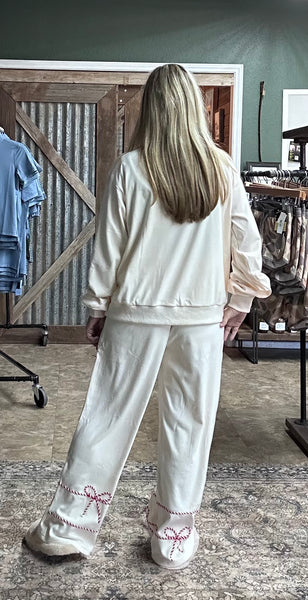 Elevate your cozy days with our Twisty Bow Sweatpants, featuring a playful waist tie detail that adds a fun twist to comfort. Made from soft fabric, these sweatpants keep you snug while showing off a stylish bow accent that ties your look together perfectly. Whether lounging or running errands, enjoy the perfect mix of comfort and charm.