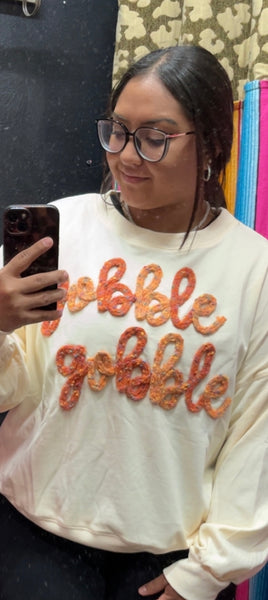 Get ready to gobble up compliments with our Gobble Gobble Sweatshirt! Stand out with the "gobble gobble" MIXED COLOR POMPOM THREAD Embroidery design and oversized fit. Perfect for cozy days and making a statement.